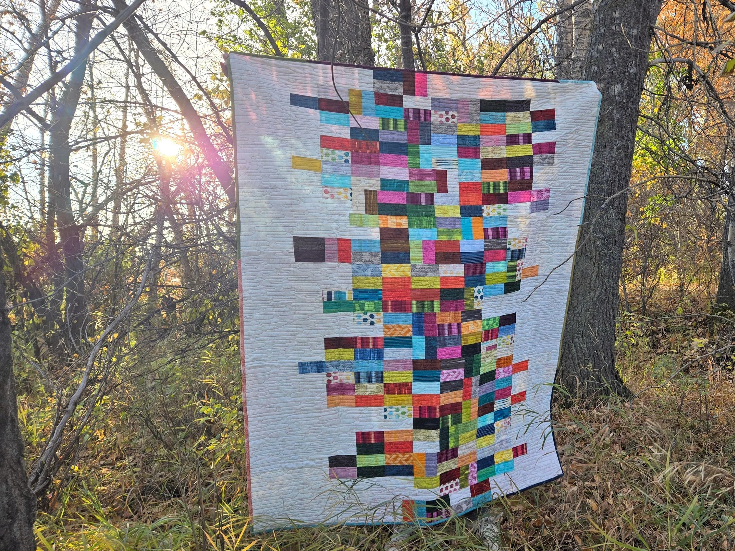 My initial play paired some cuts from a jelly roll or two with a background fabric. I made some components and did not make more for over a decade. When I rediscovered all of it I found all the fabric too. It wasn’t hard at all to finish off the top. Just a few hours of sewing, really. Then I used a bunch of the fabric to piece a wild backing.