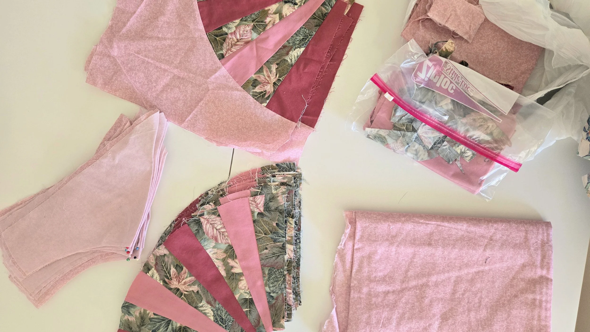 I played with a number of layouts to begin with. I tried to imagine what Lynn might have been planning. I took stock of what I had. It was clear I was going to need more fabric, first off. There was plenty of that dusty rose background, but not enough of the arc fabric to make many more blocks. So I added some colour - more greens, teal, and mustard - to modernize and round out the printed pieces of the arcs. This also enabled me to make more arcs. I was then able to use the cut background pieces and cut even more to play with. And rather than try to match the curve cut in the corners, I used a triangle piece to change up the block a little.