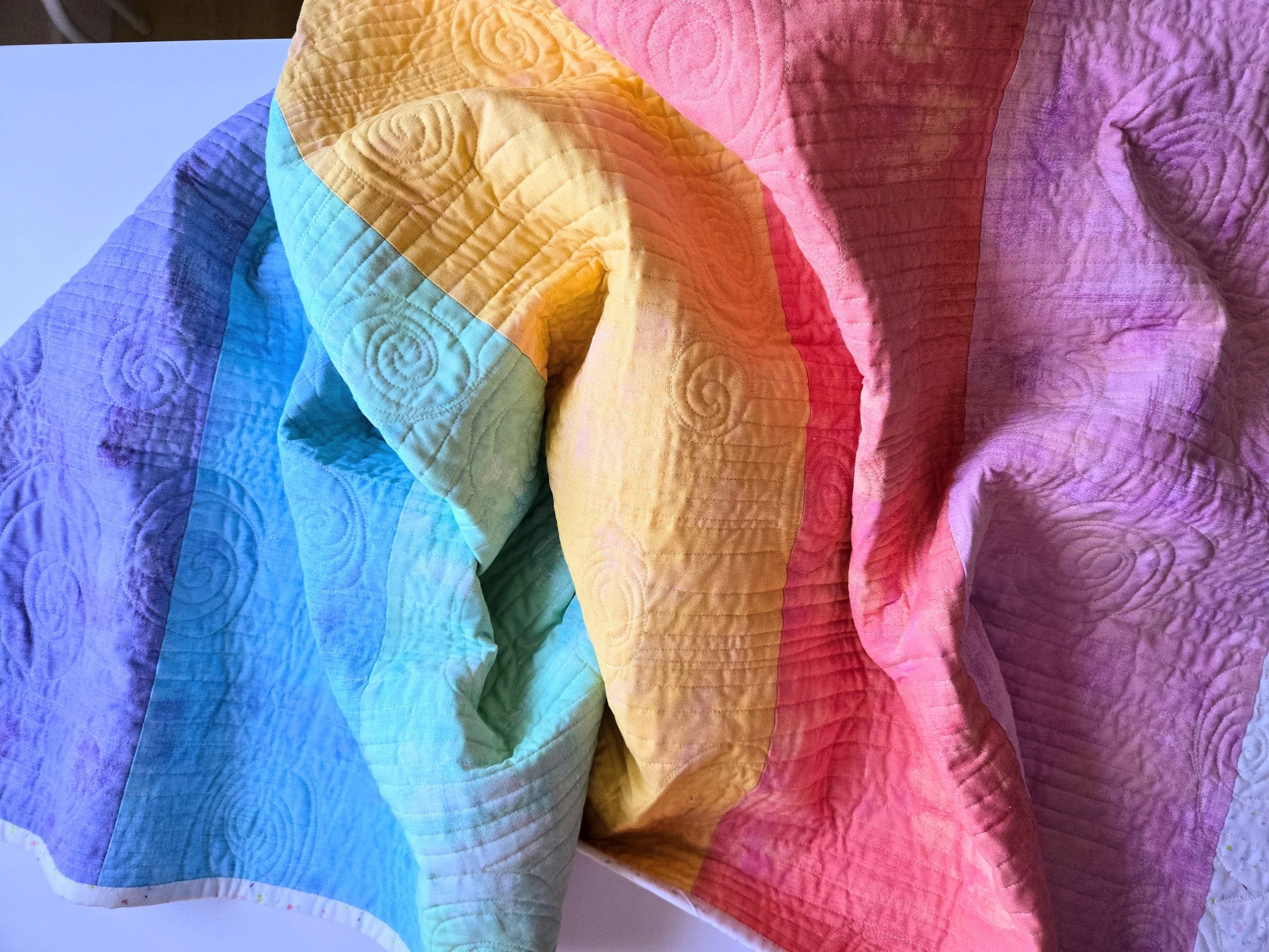 When I started the quilt I bought a meter or so (I can’t remember exactly) of each colour. At the end of the day, I had a lot of the fabric left so I used the remainders to piece the quilt back in a rainbow stripe. Look at me being all coordinated! And while the quilting on the front amounts to great texture, the pattern itself is very visible on the back. I combined spirals and lines in a free motion pattern that I did on a rented long arm. Full credit to Angela Walters and one of her books for the idea. It is pretty densely quilted and feels a bit stiff now but as soon as I wash it the cuddles will come out.
