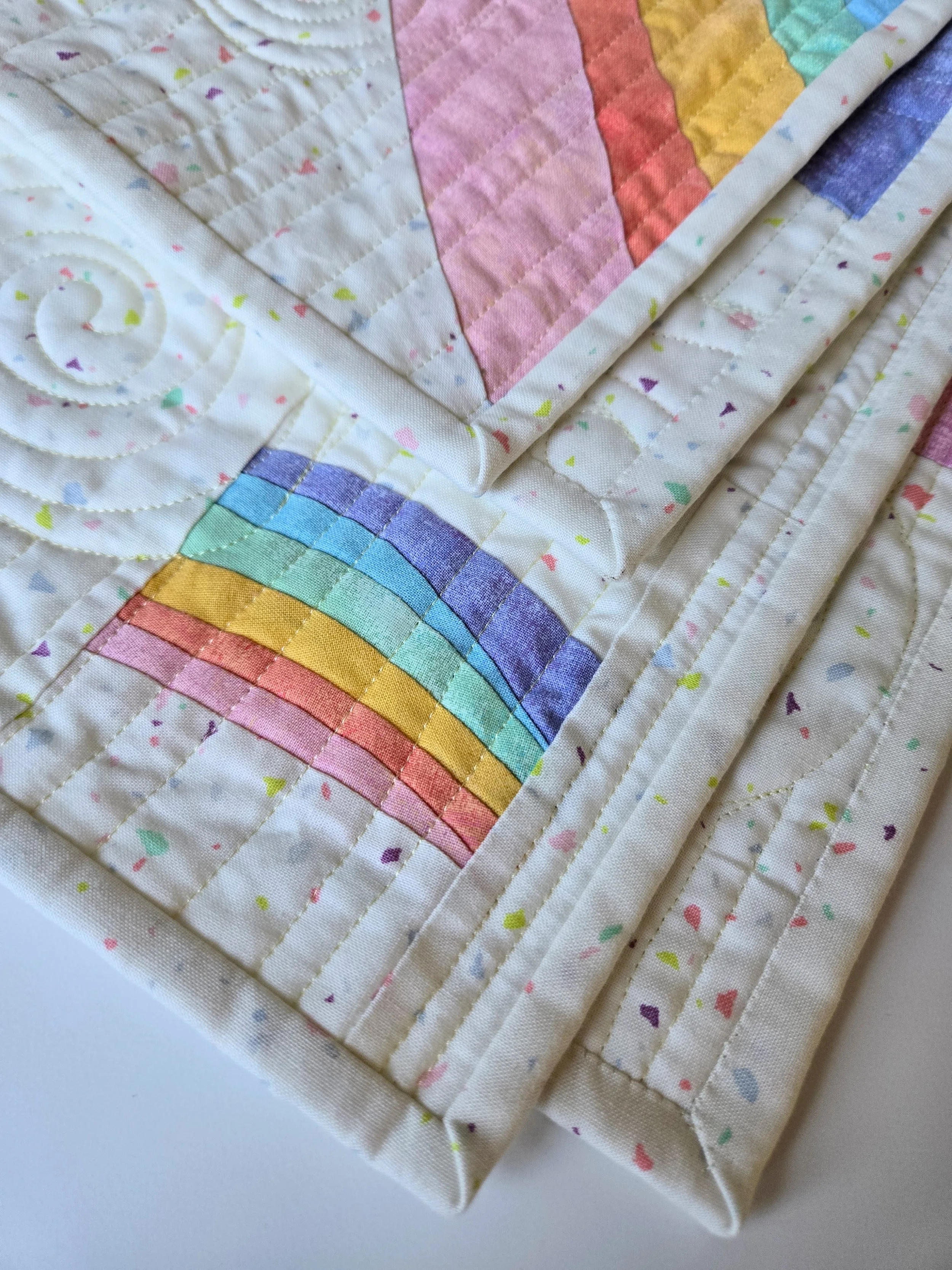 The background fabric I chose is this terrazzo inspired fabric with a creamy base. It had all the rainbow colours in it so it was perfect. Midway through the year I did have to go buy more, thankfully my local quilt shop still had it in stock! Of course, I bought more than I needed that time so it was ready for me to round out the rainbow stripe backing AND use it for the binding. We know how I love a contrast binding, but this quilt asked for something more subtle. Sometimes it is good not to introduce something new when the original is already working.