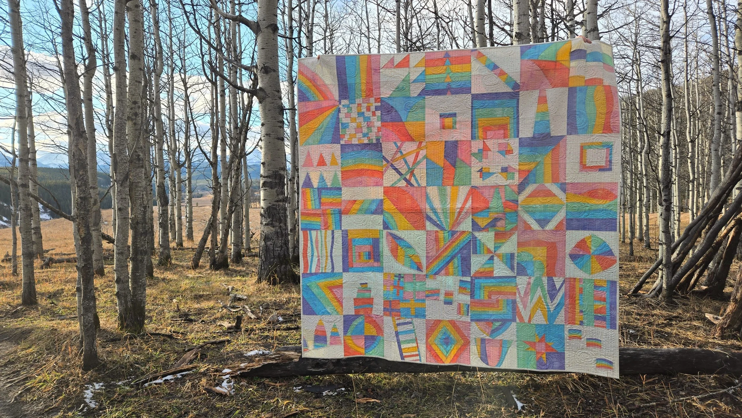 The 2024 Iteration of the Quilters’ Playcation Adventure Sewalong is now a finished quilt. Well, one of the versions I made. (The other one remains an unquilted quilt top.) For 49 weeks in 2024 I hosted a live session on Instagram where we made an improv block. My theme for the year was Rainbows so each block contained the 6 colours of a rainbow (or any gradient chosen), and half the blocks included an additional background fabric.