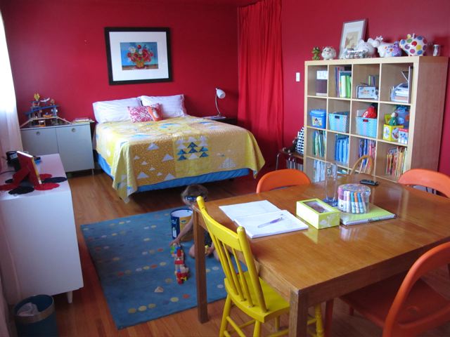 Much brighter, filled with far more functional space. Table for crafts, writing, and more. Open space for games, building things, and a landing pad for jumping off the bed. Only one bookshelf now with edited items. A revamped dresser. A new quilt.