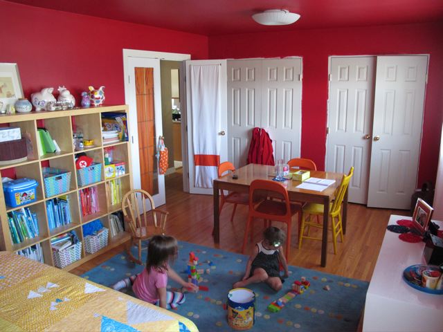 I finally got the finishing touches put on the girls' room this week. That is, I got the curtains hemmed, cleaned it up again, and Hubby was home with his tools to help hang the artwork. Here is the before of their room.